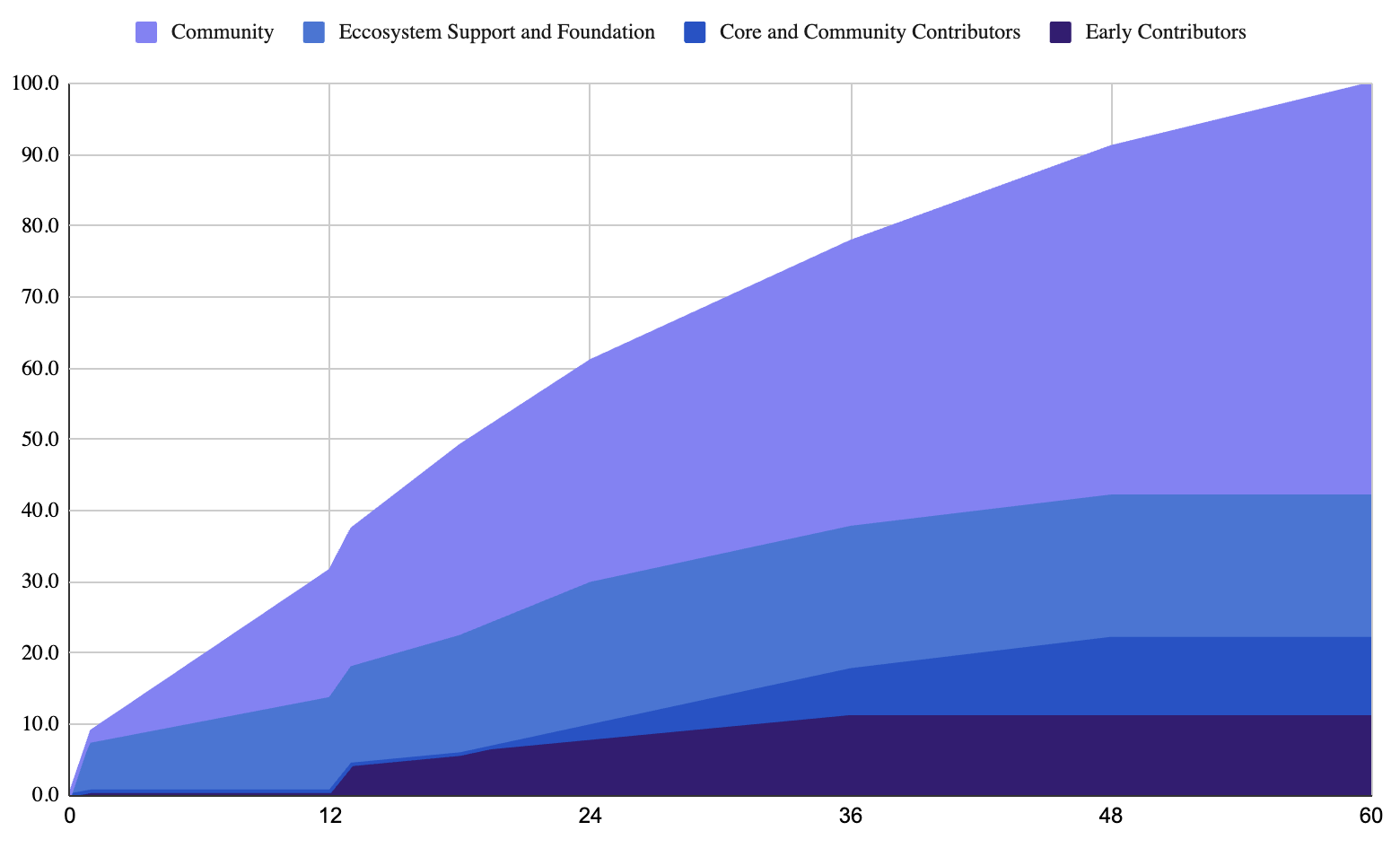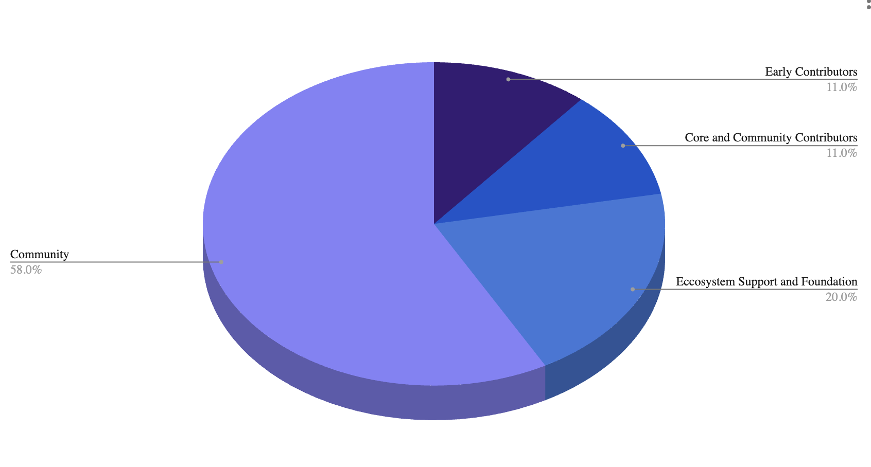 <table><thead><tr><th width="512">Category</th><th>%</th></tr></thead><tbody><tr><td><strong>Early Contributors</strong> </td><td>8%</td></tr><tr><td><strong>Early Advisors</strong> </td><td>3%</td></tr><tr><td><strong>Core Contributors &#x26; Advisors</strong> </td><td>11%</td></tr><tr><td><strong>Ecosystem Support &#x26; Foundation</strong></td><td>20%</td></tr><tr><td><strong>Community</strong> - Incentives</td><td>13.5%</td></tr><tr><td><strong>Community</strong> - DAO - Liquidity Mining &#x26; Community Rewards</td><td>44.5%</td></tr></tbody></table>